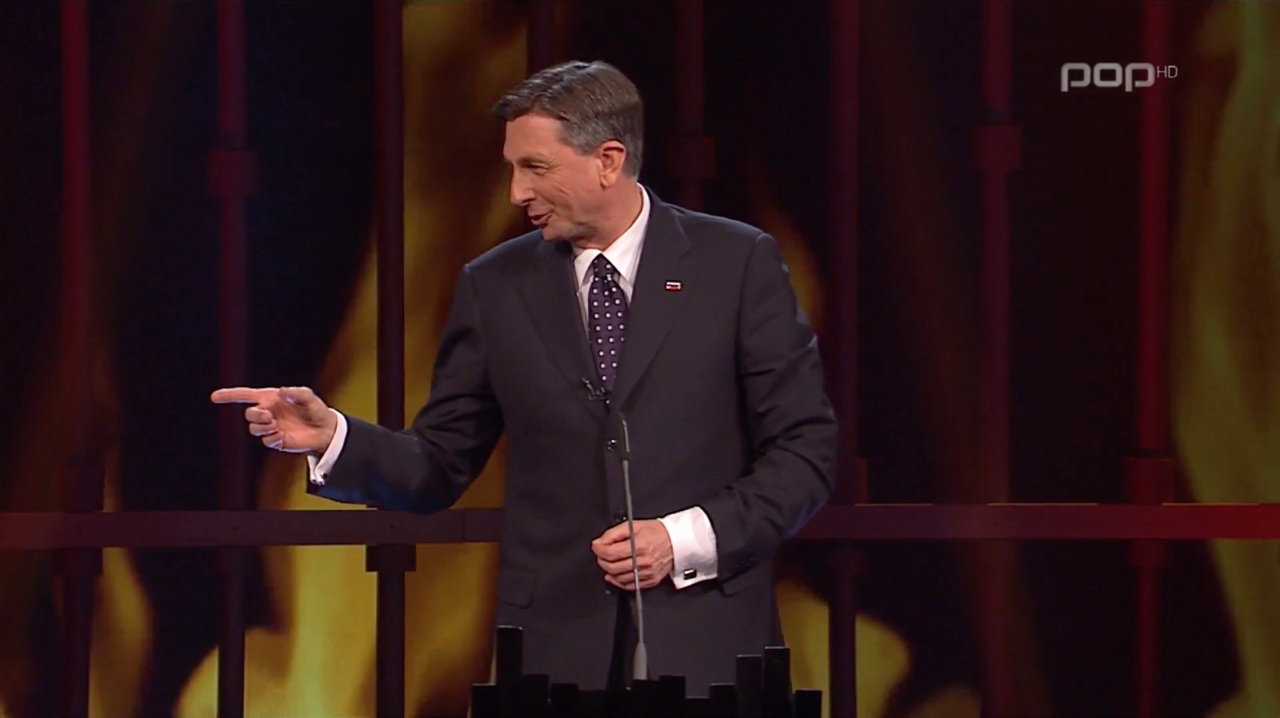 Vrhunec oddaje je bil nesporno predsednikov finalni nastop. V njem se pričakuje, da se bo svojim komentatorjem nekako oddolžil. Pustimo ob strani, kako je bil pri tem kot “nekdo, ki mu ploskajo, ker dela eno napako za drugo”, kot se je izrazil, uspešen. Zadnji stavki njegovega nastopa so najbolj pomenljivi: