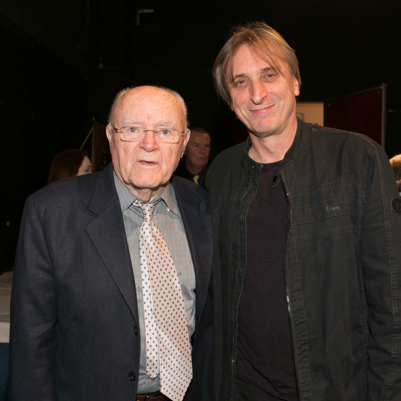 Avtor Svetega moža Mile Korun in režiser predstave Matjaž Zupančič po premieri prejšnjo soboto v Drami. — [Fotografija: Katja Kodba]