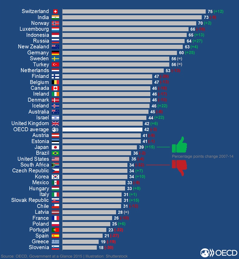 Verjamem, da predsedniki vlad v tem obdobju — Janša, Pahor, Bratuškova, Cerar — niso najslabši voditelji med članicami OECD-ja. Pa vendar smo po zaupanju v vlado povsem na repu. — [Tabela: OECD]